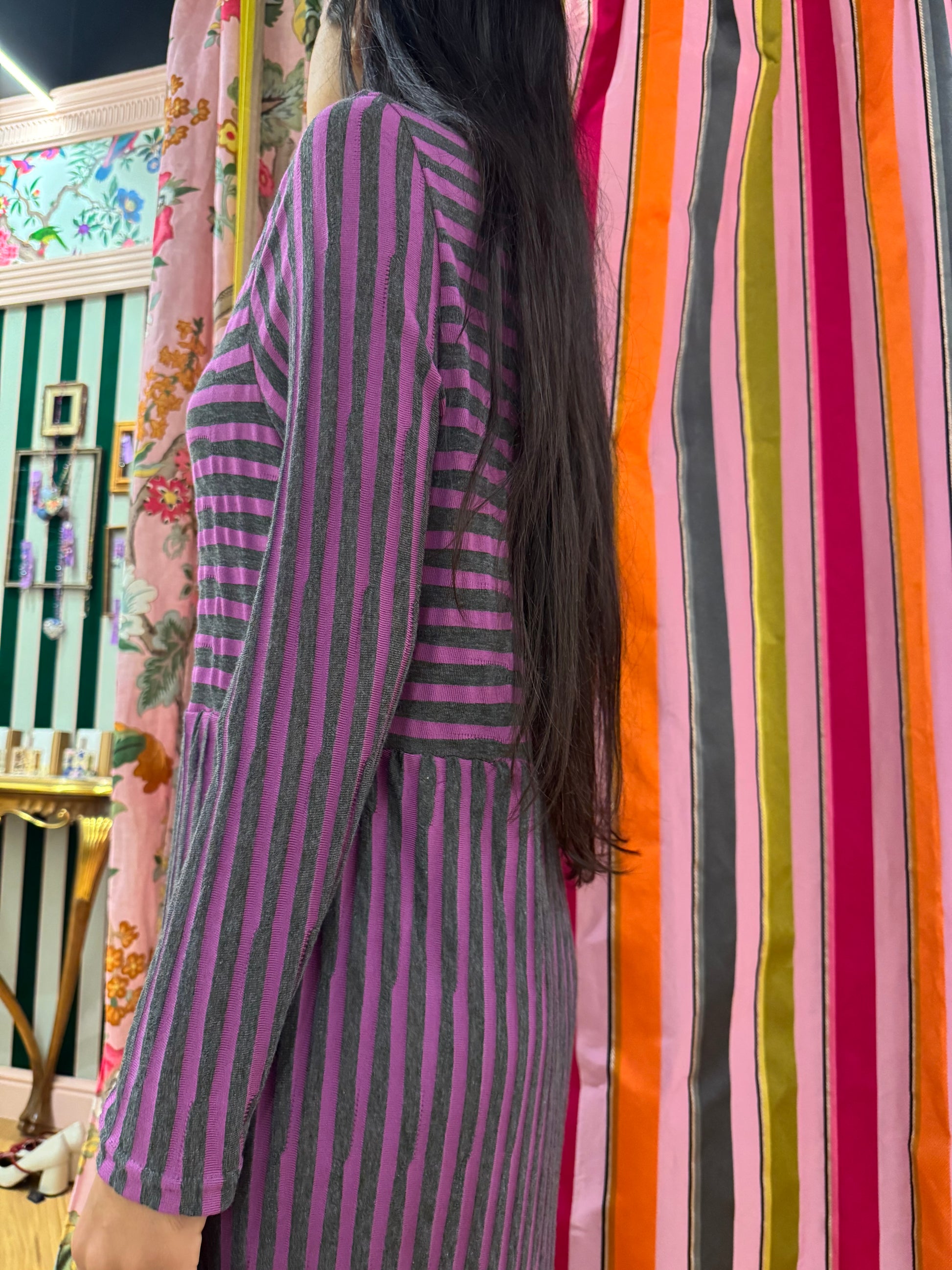 Abito in maglia a righe in color viola e grigio. Lunghezza fino alla caviglia. Vestibilità morbida da tg 40 a tg 48. Pezzo unico, fatto a mano.