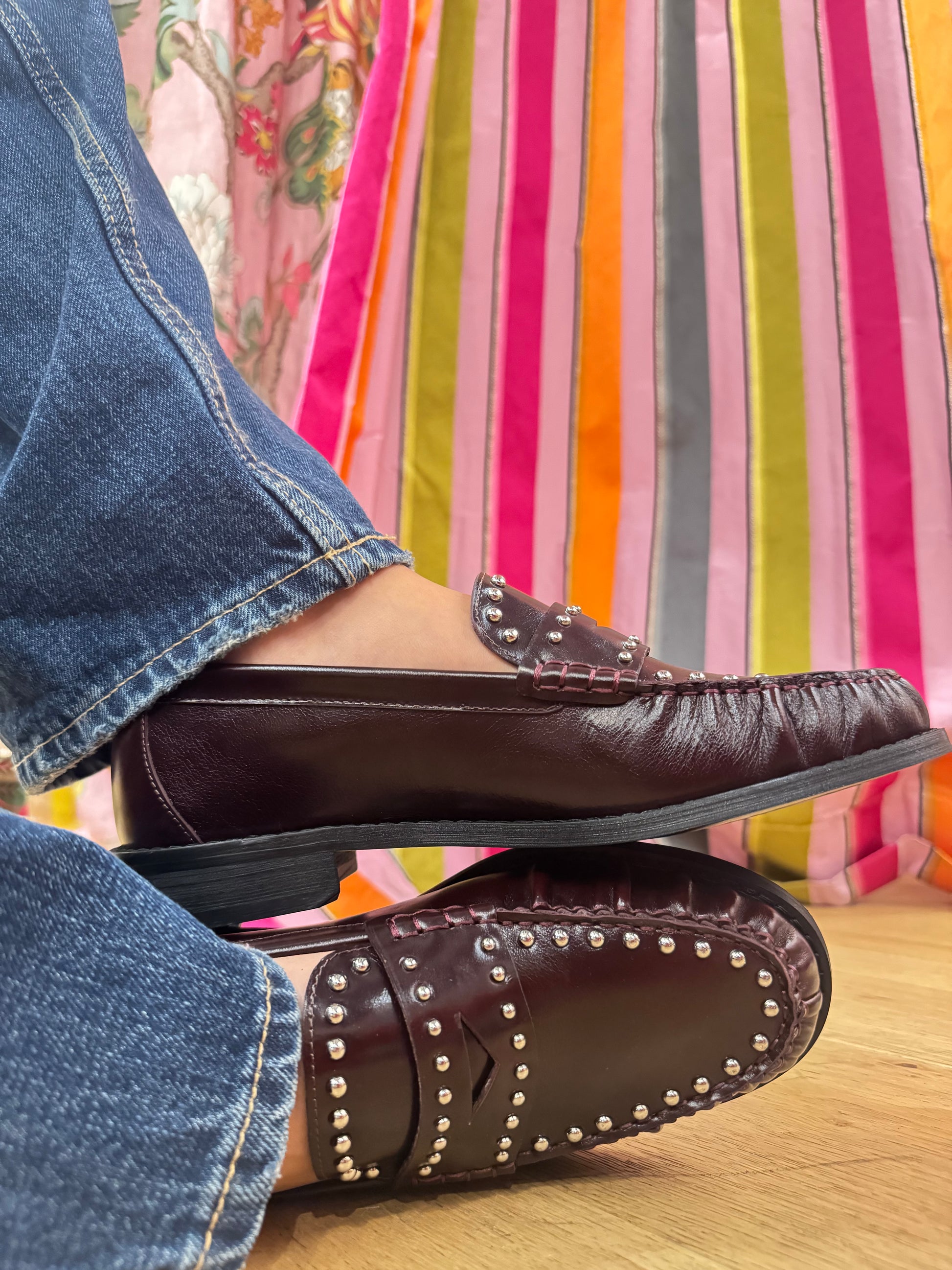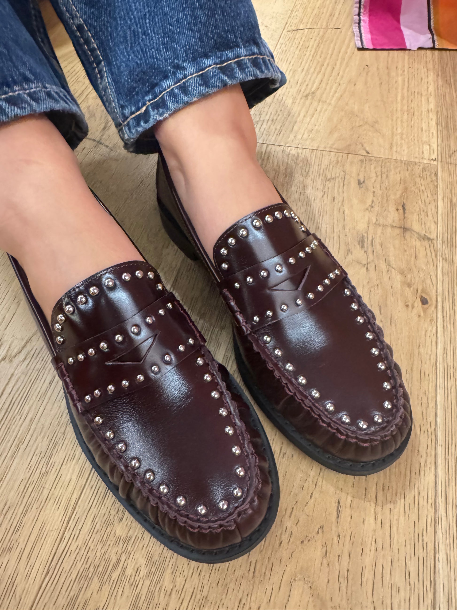 Mocassino in pelle marrone scura arricchito da borchie metalliche. Pianta larga e comoda. Fodera e sottopiede in pelle. Fondo in gomma con tacco alto 2 cm. Calzata regolare