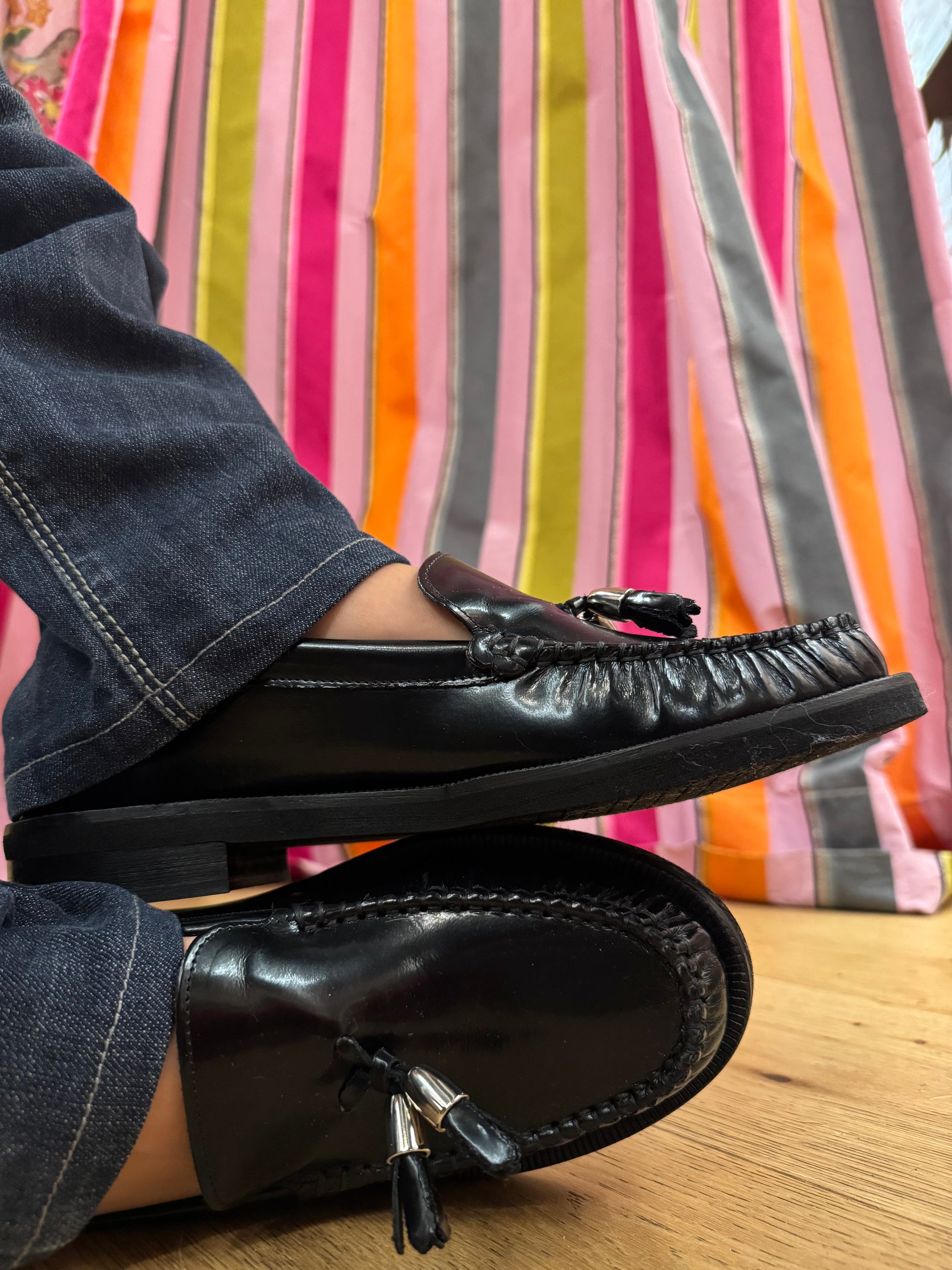 Mocassino da donna in pelle abrasivata nera con nappine. Fondo in gomma con tacco alto 2 cm. Pianta larga e comoda. Calzata regolare. Prodotto italiano.