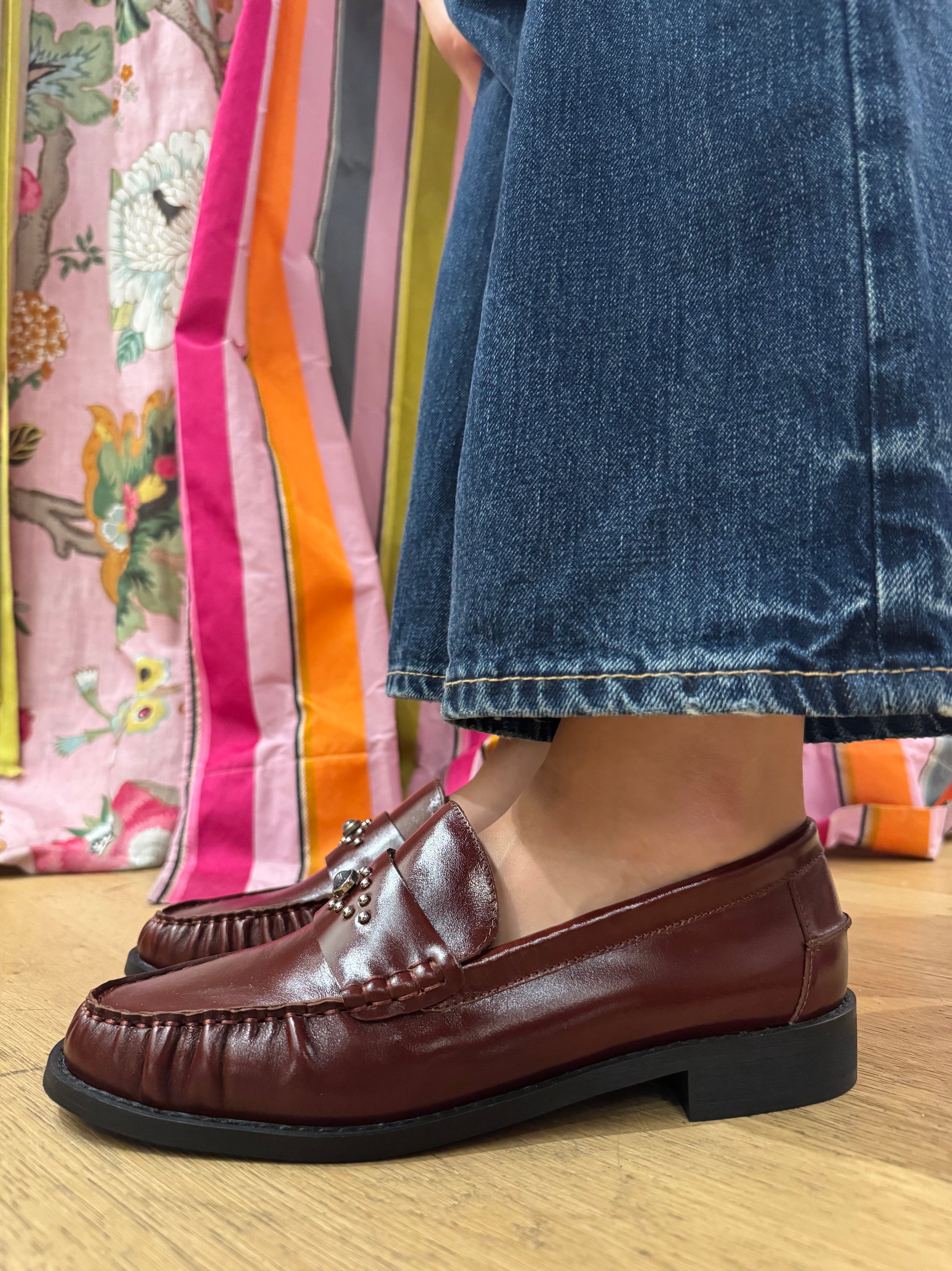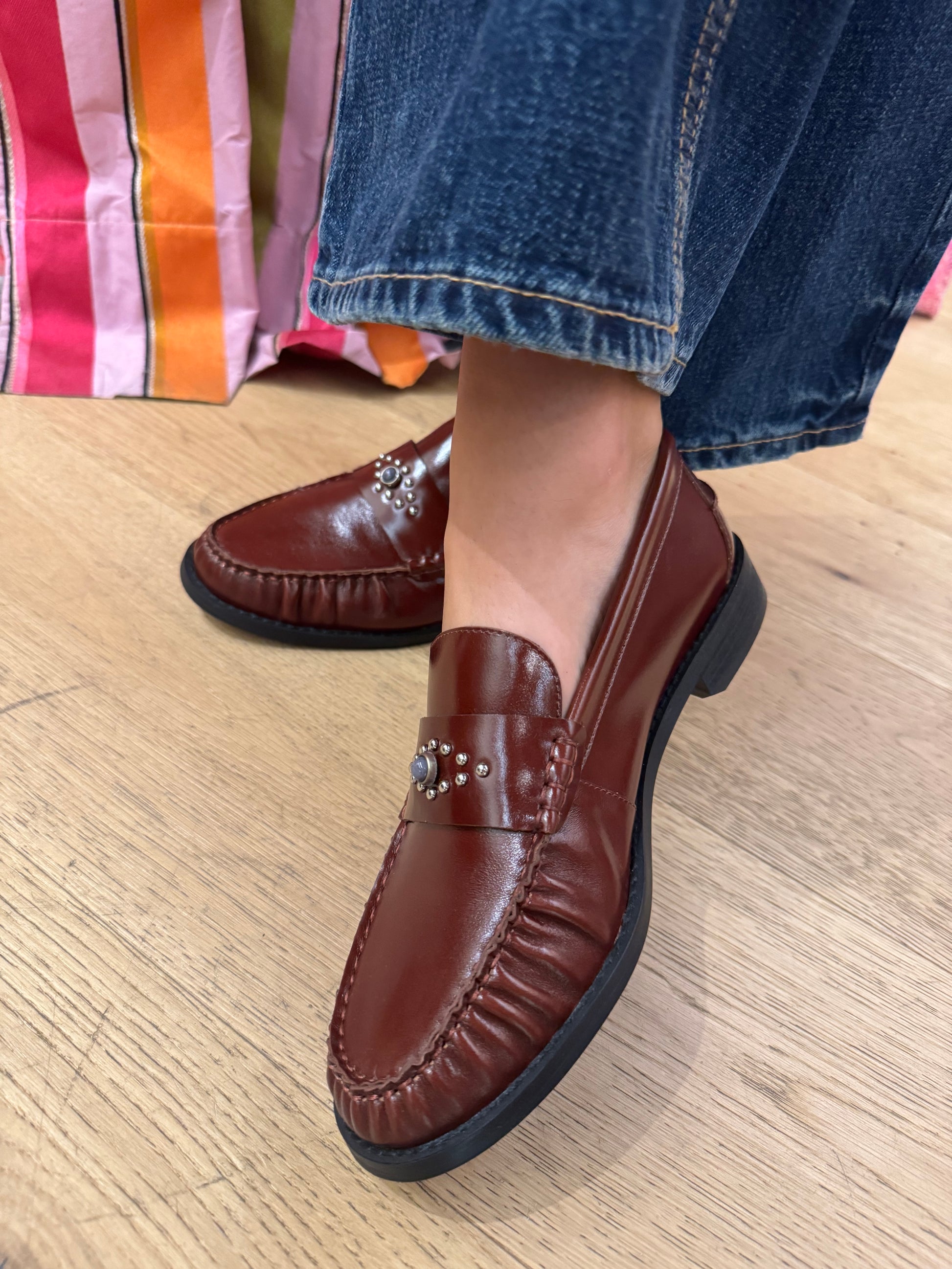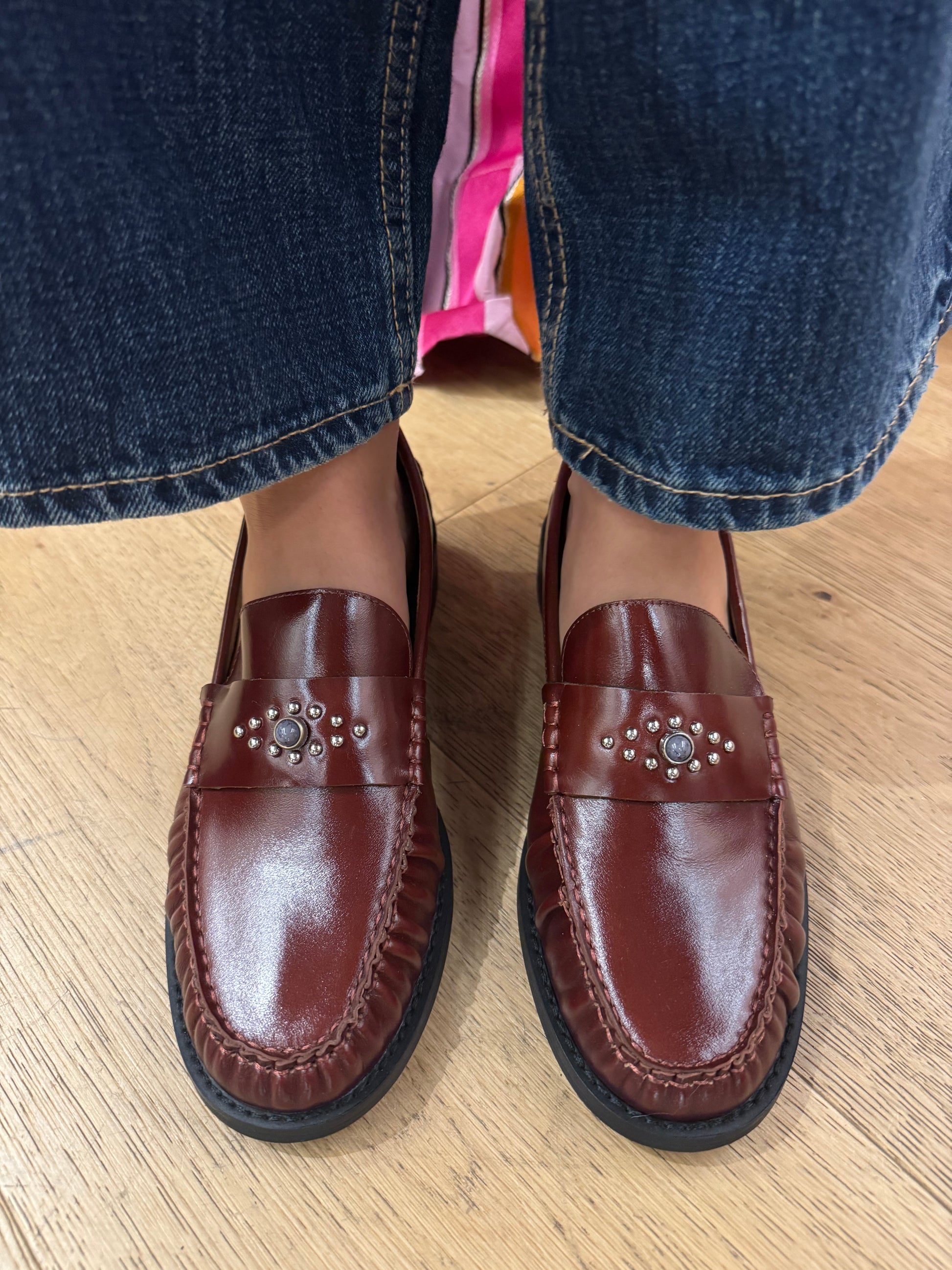 Mocassino realizzato in morbida pelle color mattone con applicazioni di borchie e cabochon in grigio. Fodera e sottopiede imbottito in pelle. Fondo in gomma con tacco alto alto 2,5 cm. Pianta larga e comoda. Calzata regolare