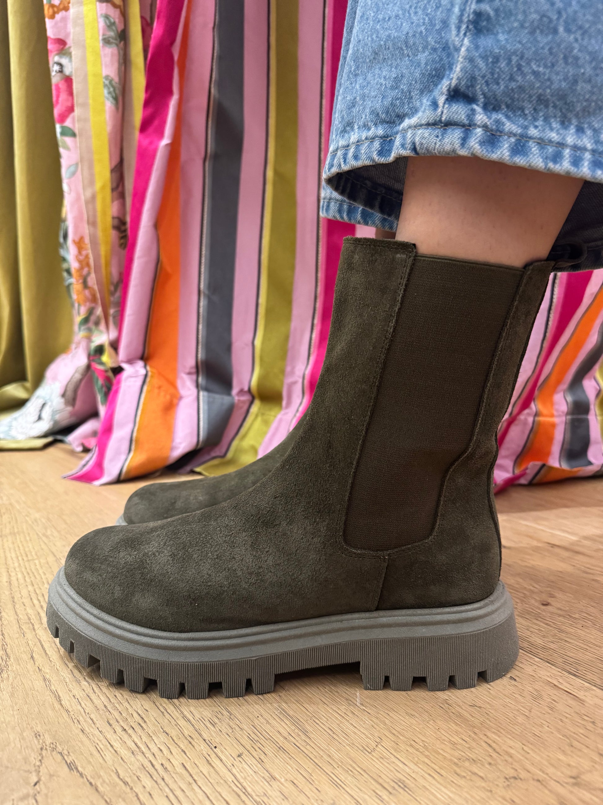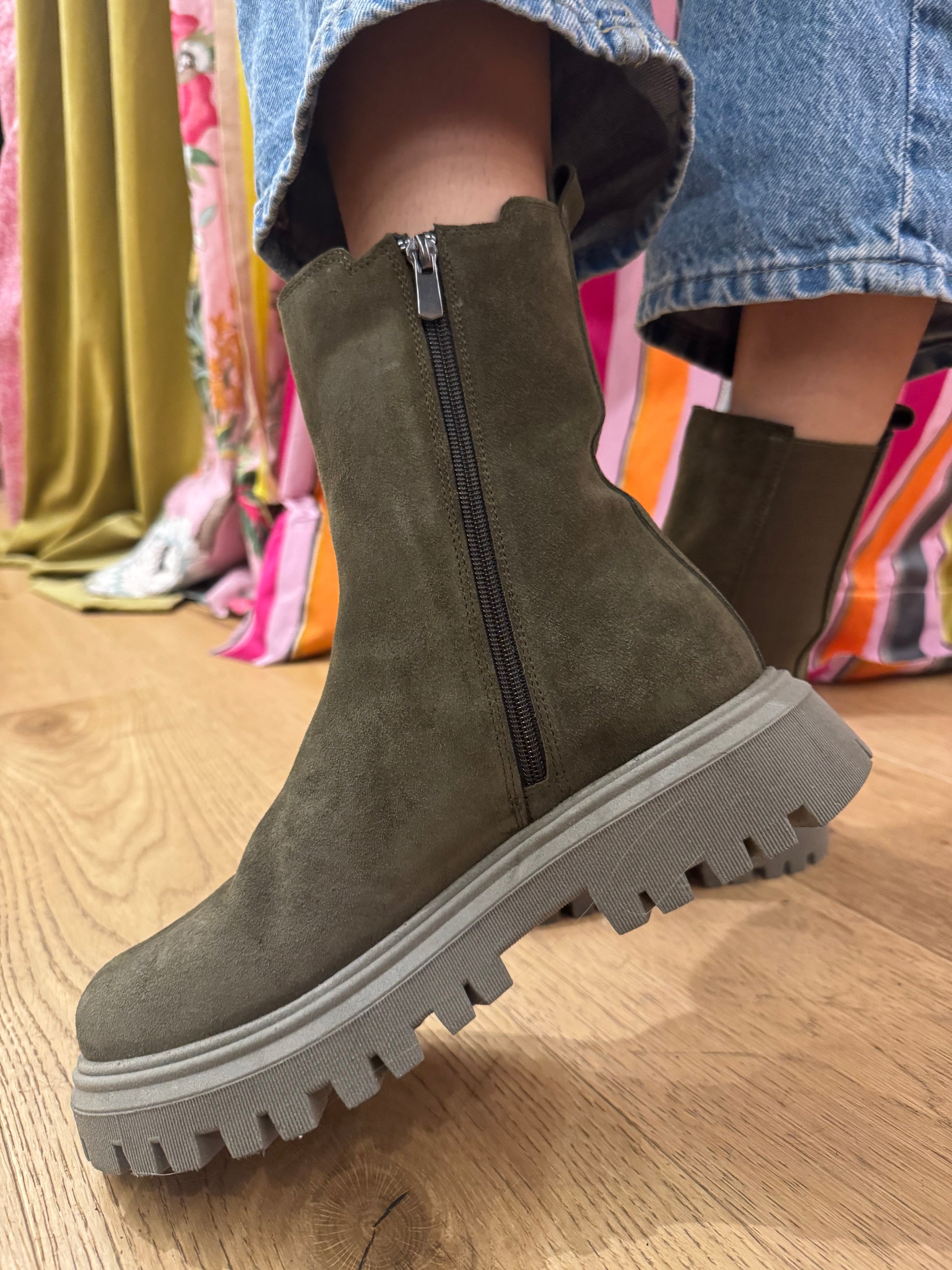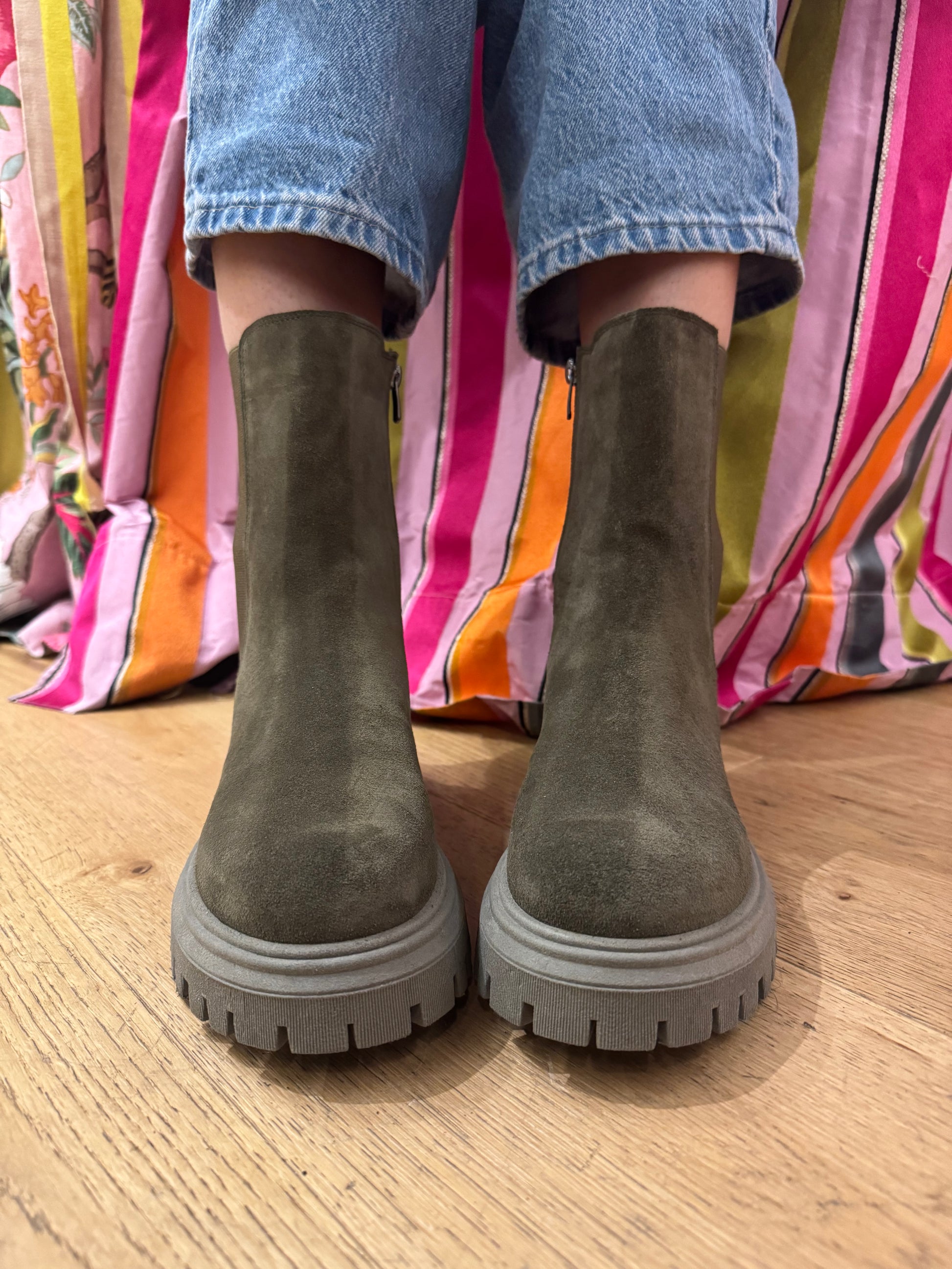 Morbido combat realizzato in pelle scamosciata verde oliva. Elastico laterale in tinta. Zip interna. Fondo in gomma alto 4cm. Pianta larga e comoda. Fodera in caldo tessuto. Plantare estraibile. Calzata abbondante, si consiglia l'acquisto di un numero in meno.