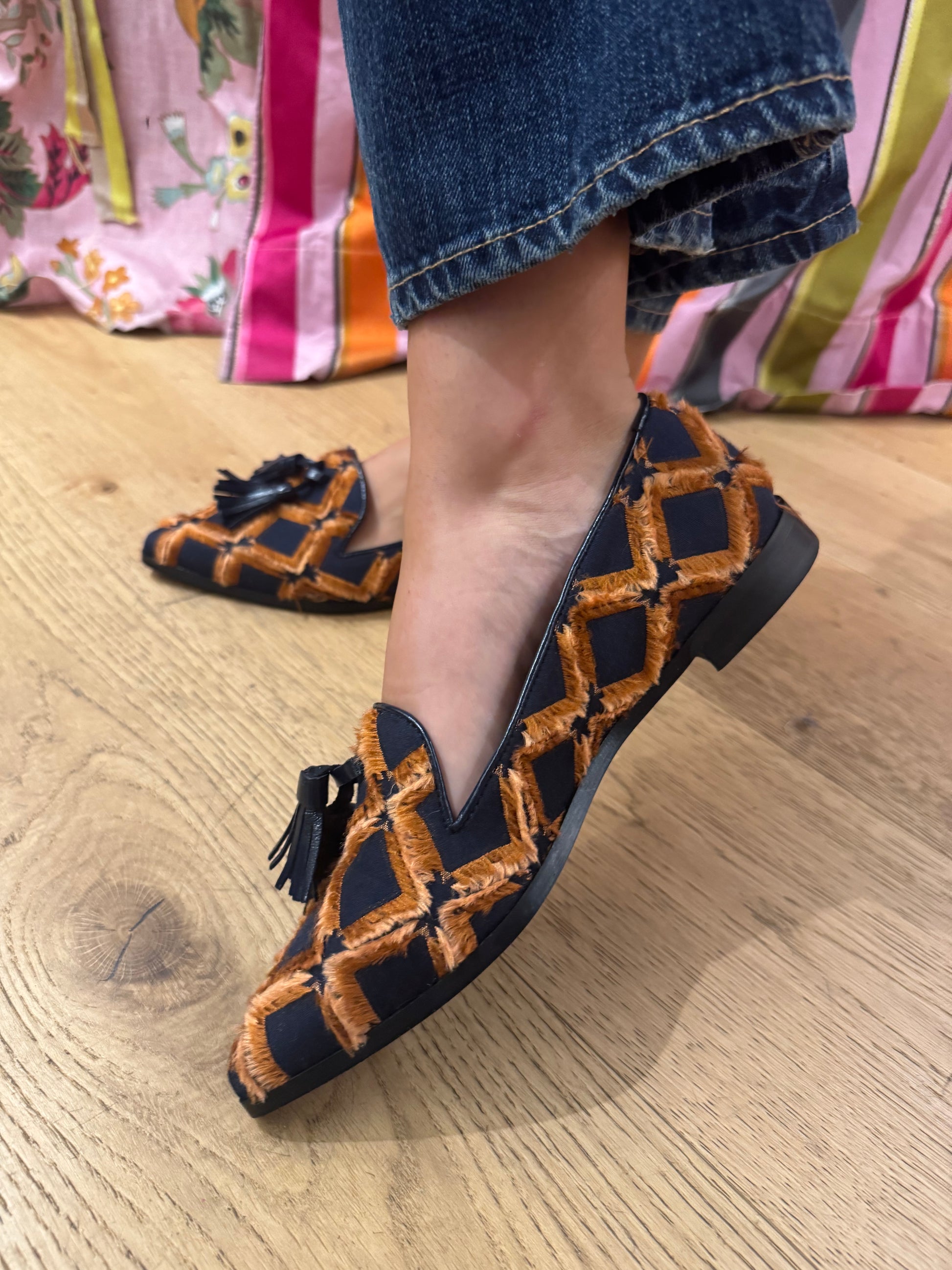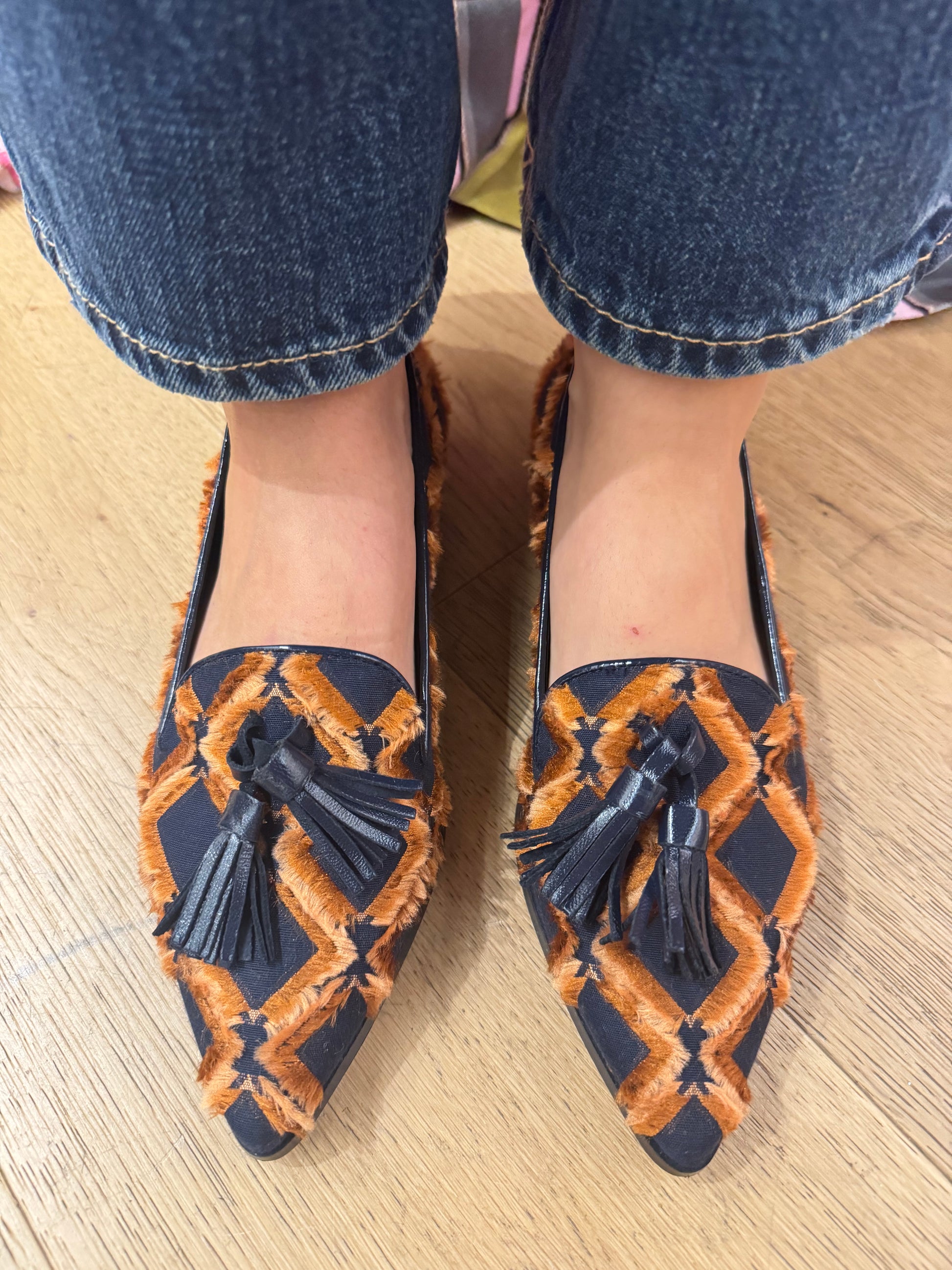Scarpa modello slippers realizzata in tessuto in fantasia geometrica sulle tonalità blu e arancione. Forma affusolata. Nappine realizzate in naplak blu. Fodera e sottopiede imbottito in pelle. Tacco alto 2 cm con fondo in gomma antiscivolo. Prodotto artigianale fatto in Italia. Calzata regolare.
