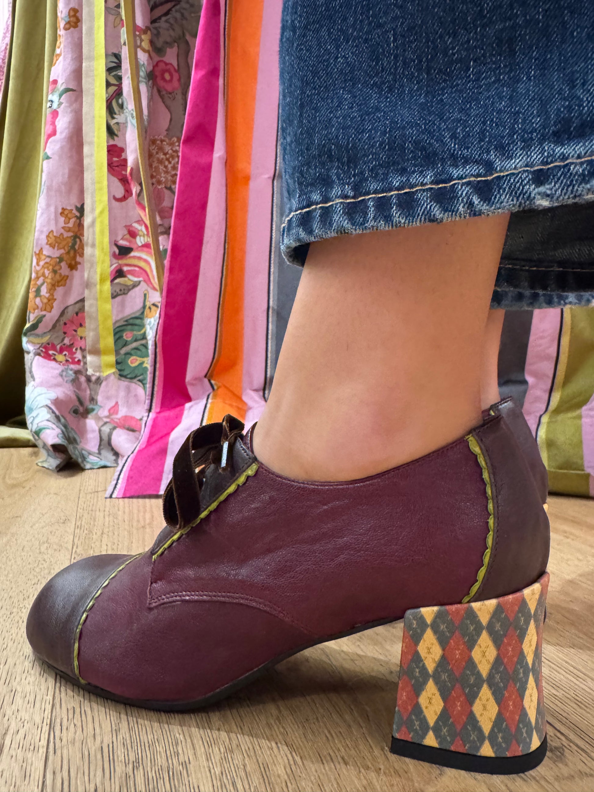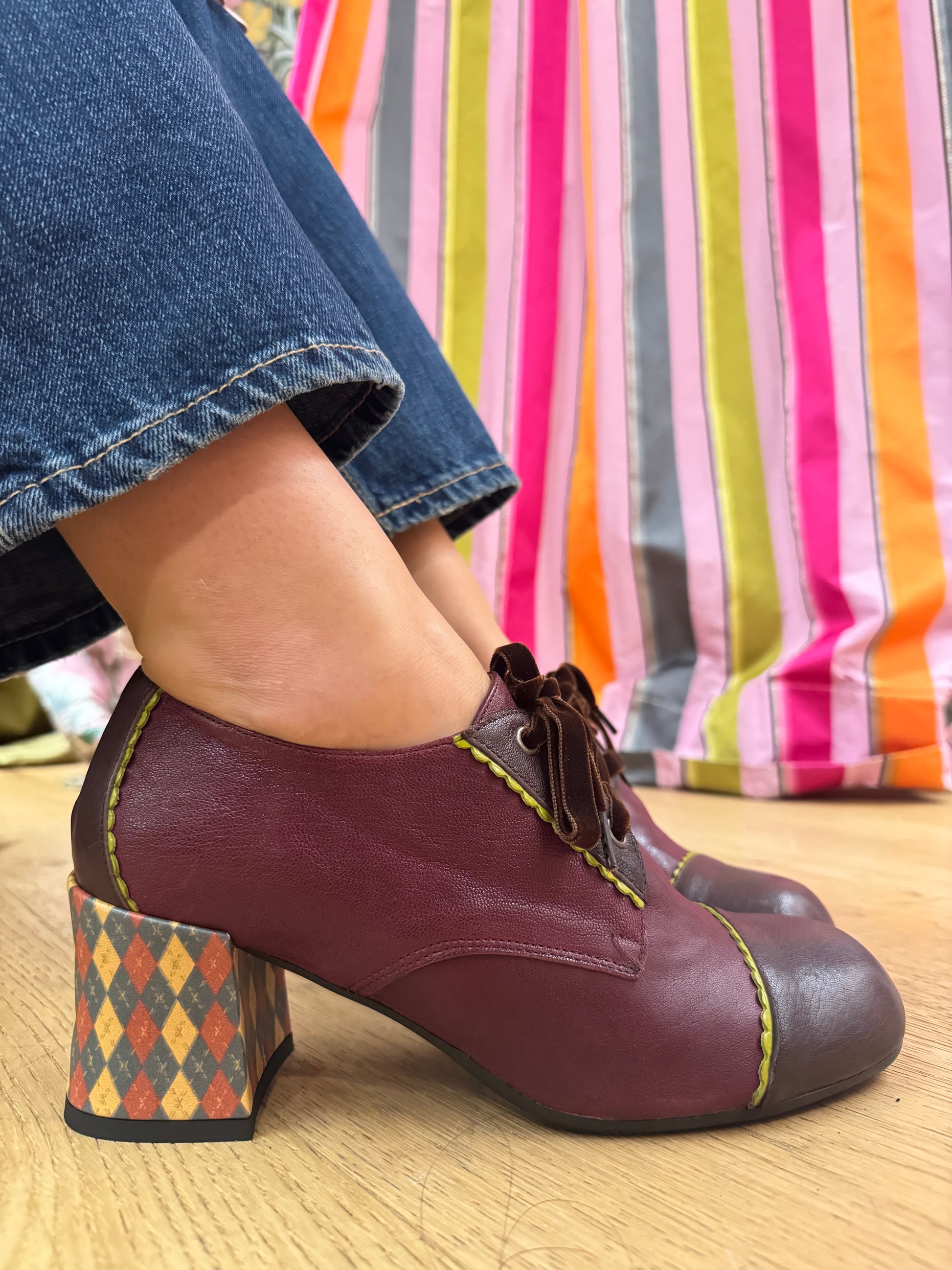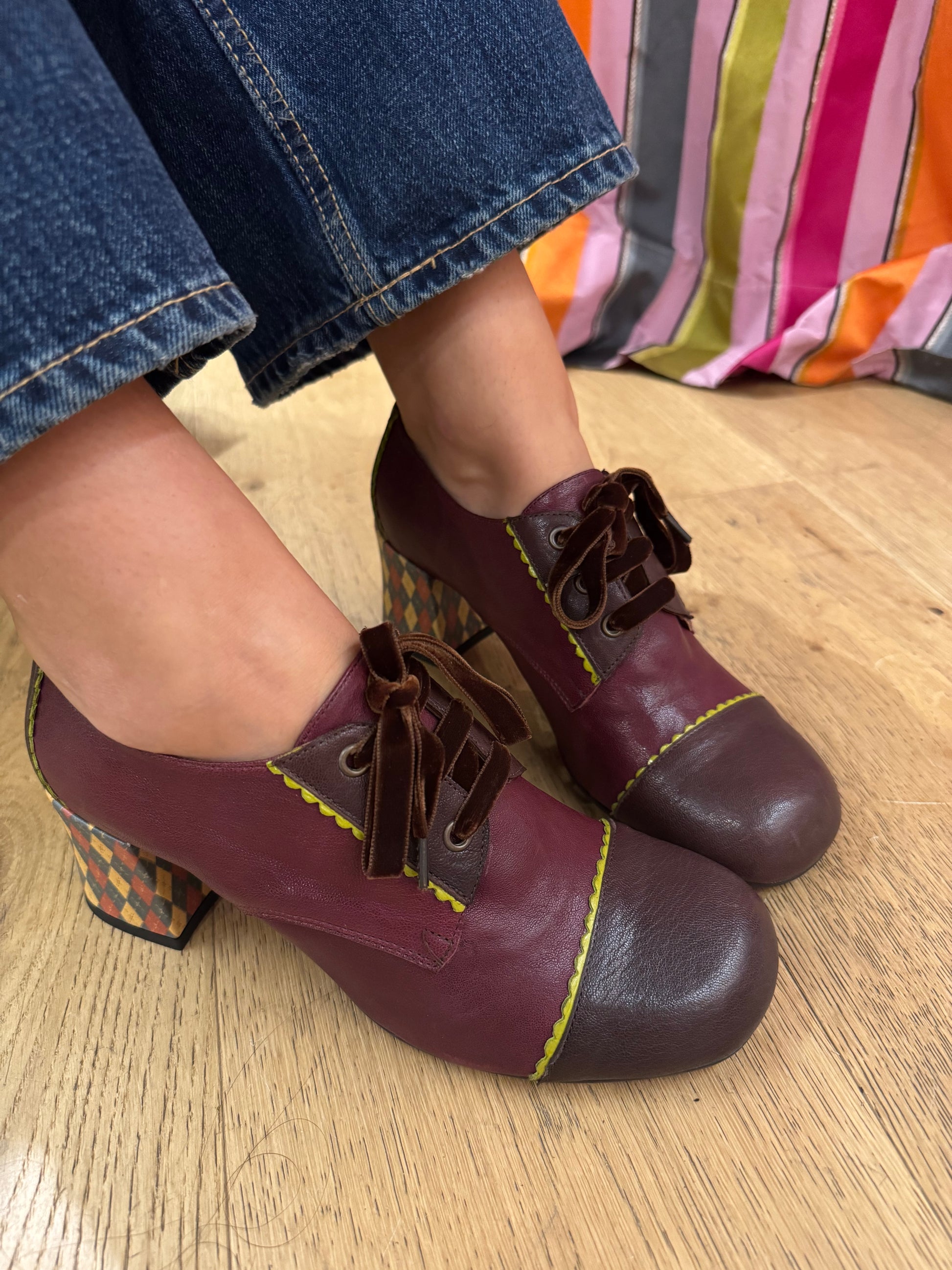 Eleganza a ogni passo. Scarpa modello francesina con lacci in velluto. Realizzata in morbidissima pelle color bordeaux con dettagli verde acido. Tacco optical alto 7 cm. Fodera e sottopiede in pelle. Pianta larga e comoda. Calzata regolare. Prodotto artigianale italiano.