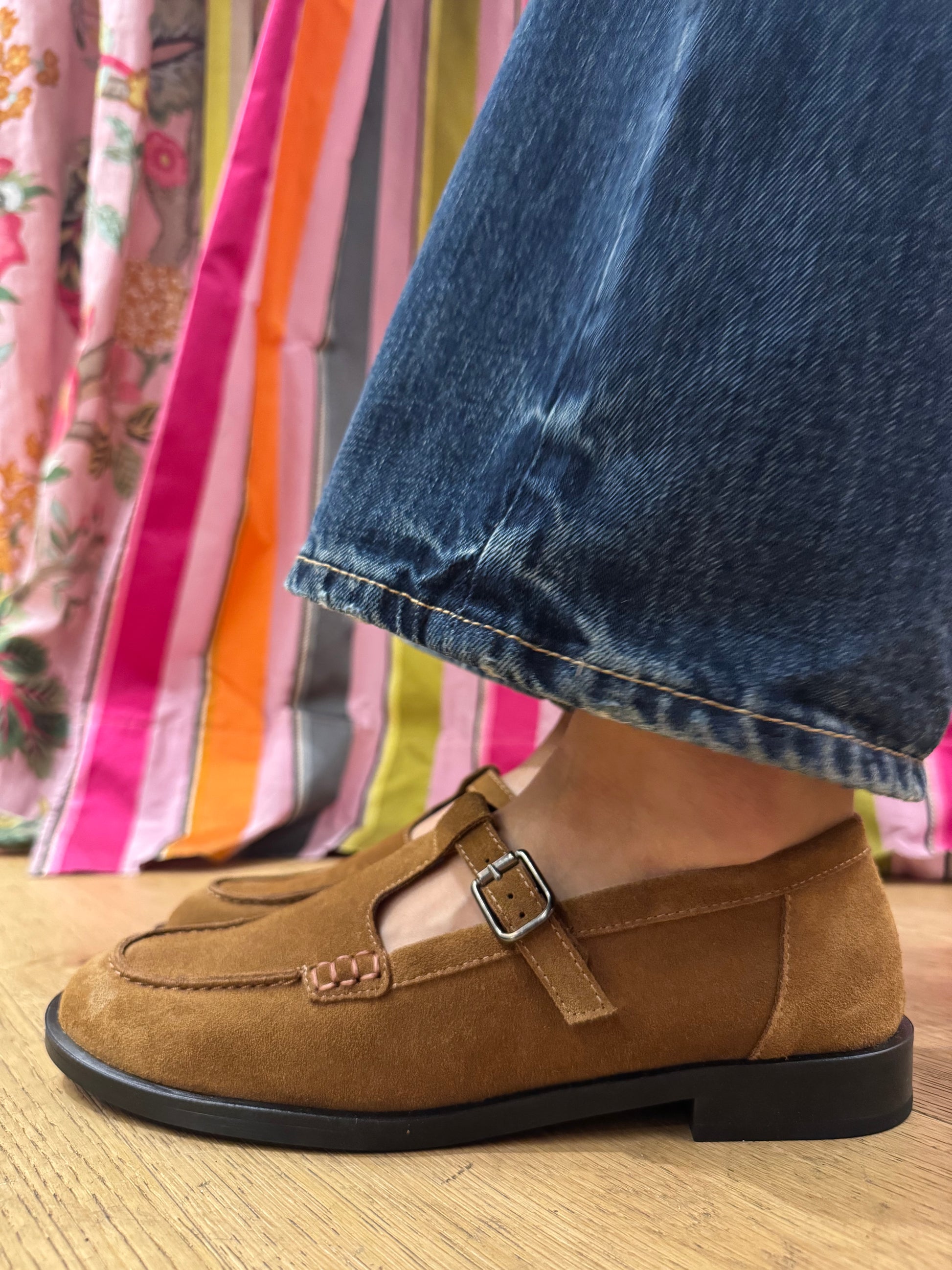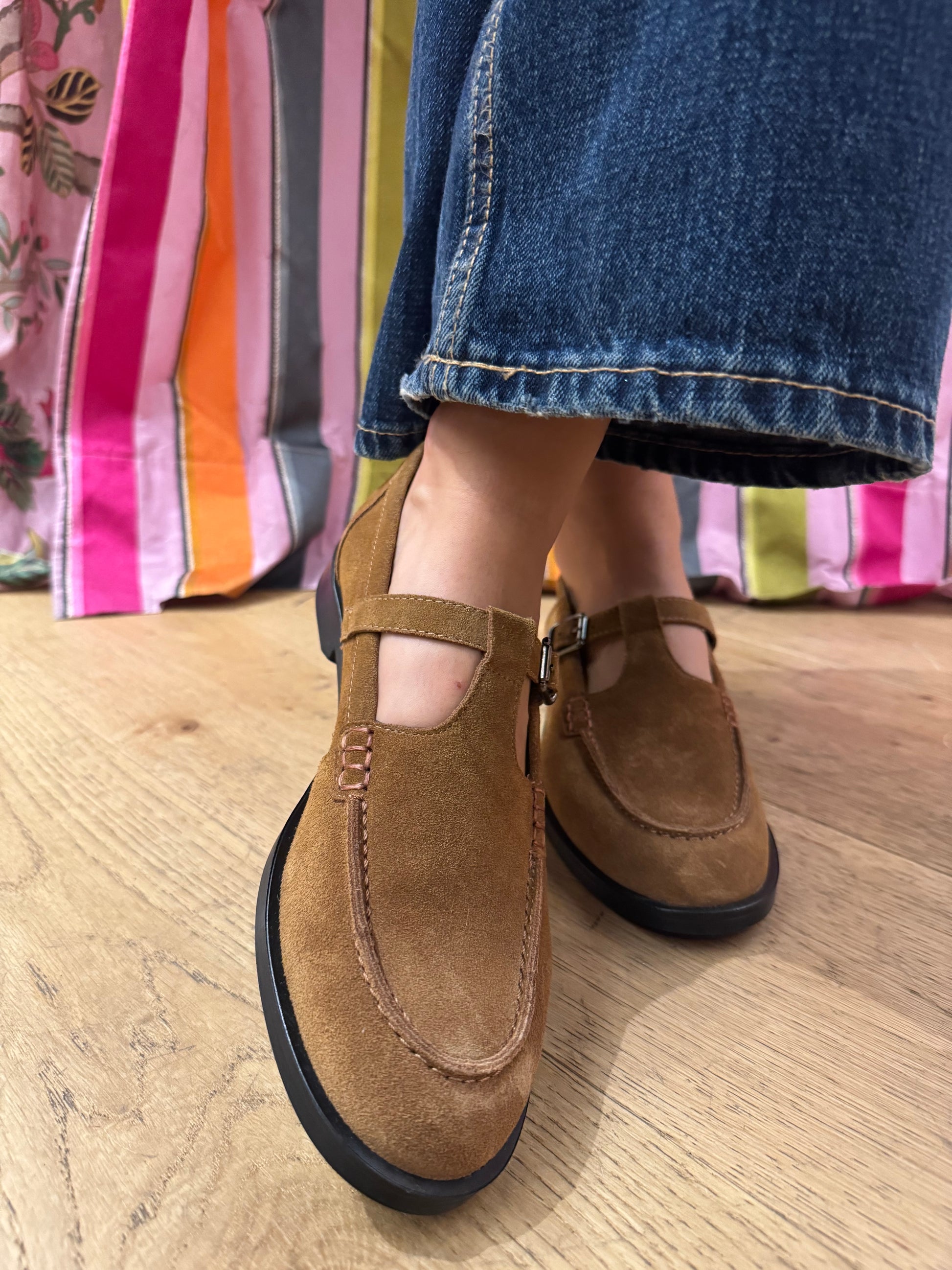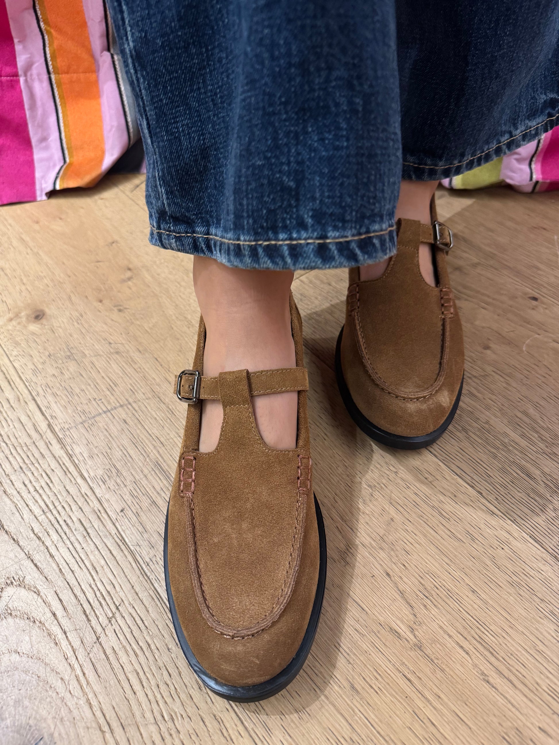 Questo modello da donna è un classico, occhietti sulla vaschetta e chiusura con cinturino regolabile. Richiami vintage, reinterpretazioni ironiche ed heritage artigianale. Realizzato in pelle scamosciata color tabacco. Fodera e sottopiede imbottito in pelle. Fondo in gomma con tacco alto 2 cm. Calzata comoda e regolare.