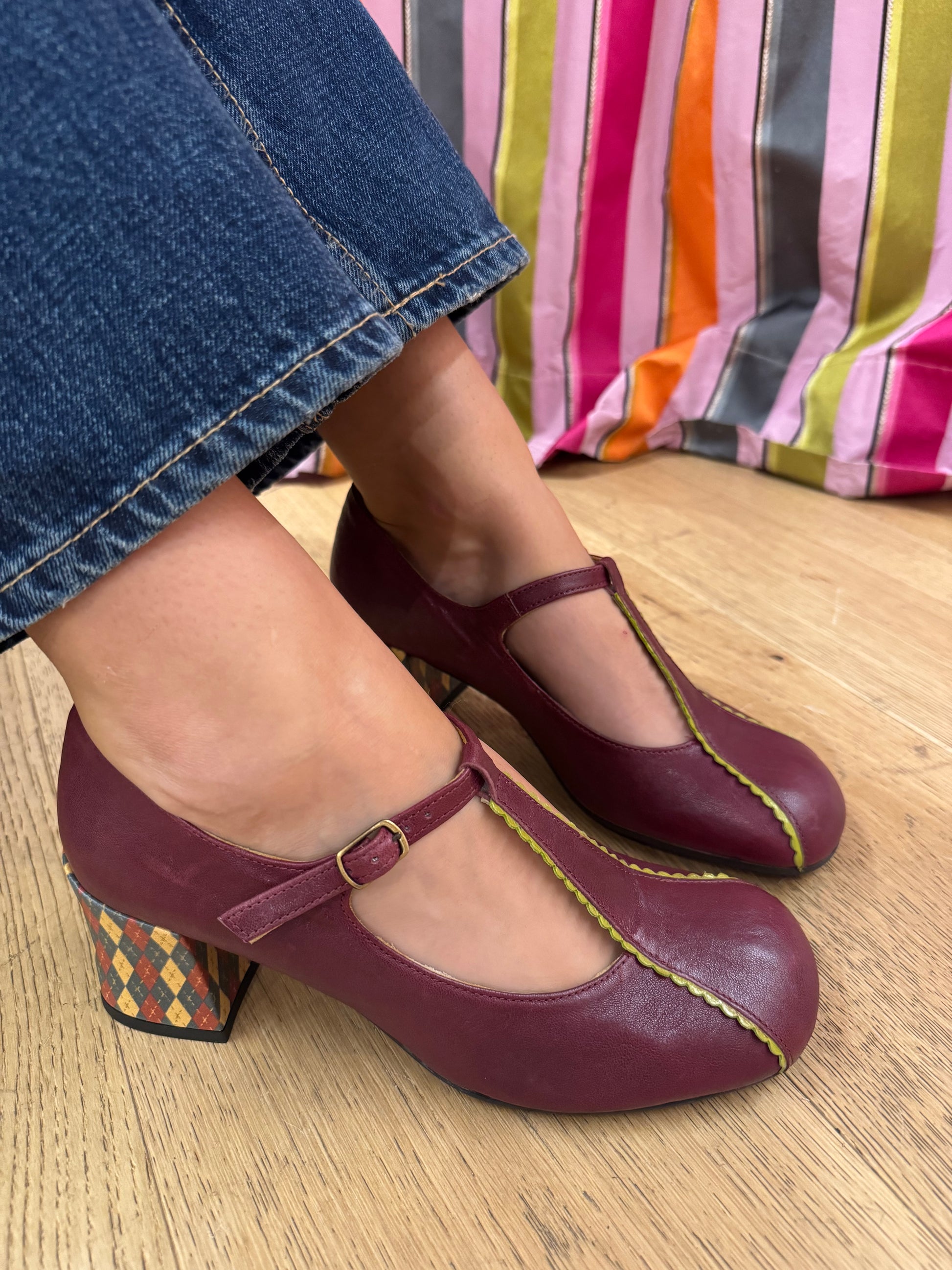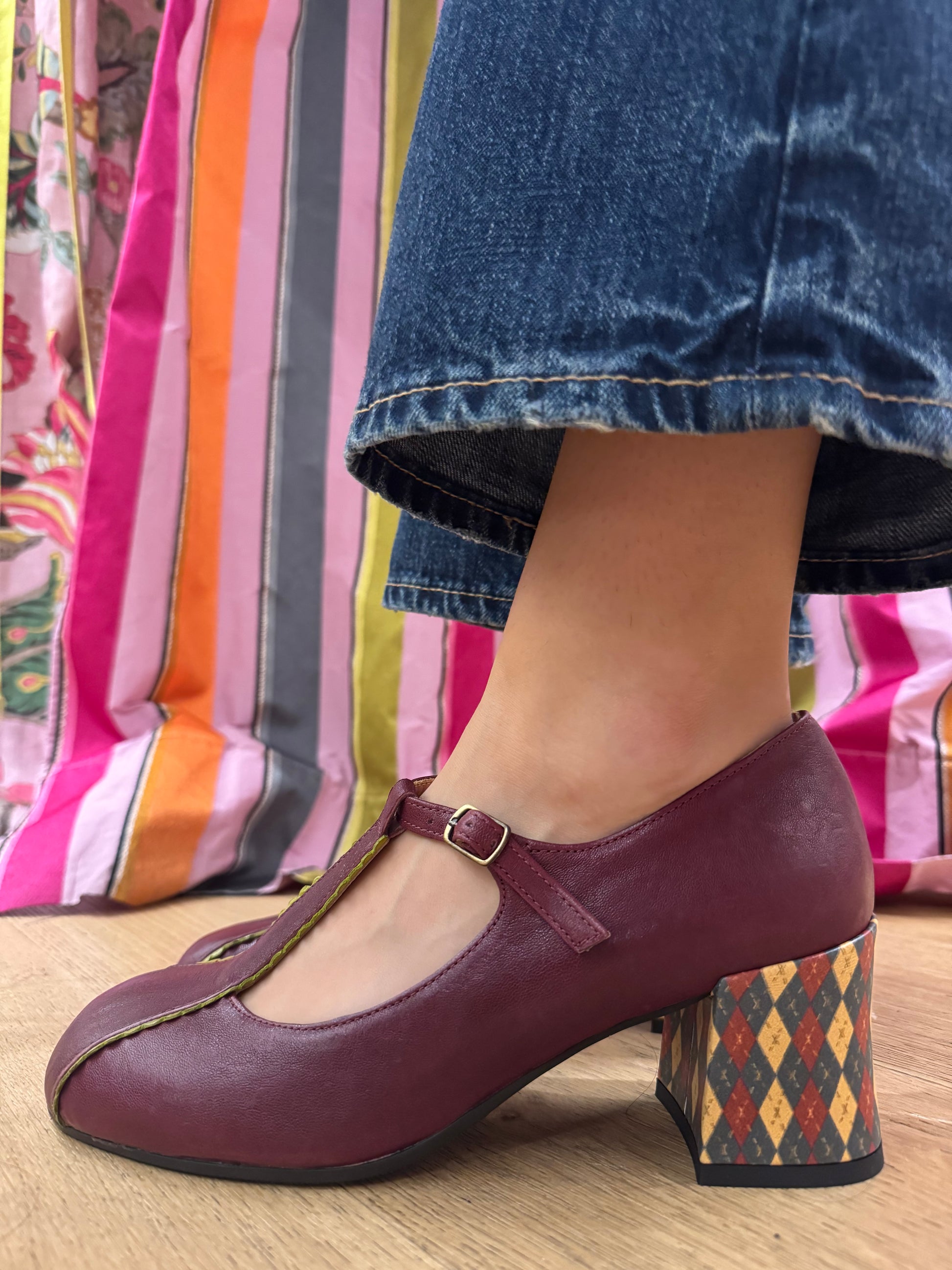 Le scarpe t-bar scendono in pista come protagoniste delle tendenza vintage-style. Variante realizzata in morbidissima pelle color bordeaux con dettagli verde acido. Cinturino regolabile sul collo del piede. Tacco optical alto 7 cm. Fodera e sottopiede in pelle. Pianta larga e comoda. Calzata regolare. Prodotto artigianale italiano.
