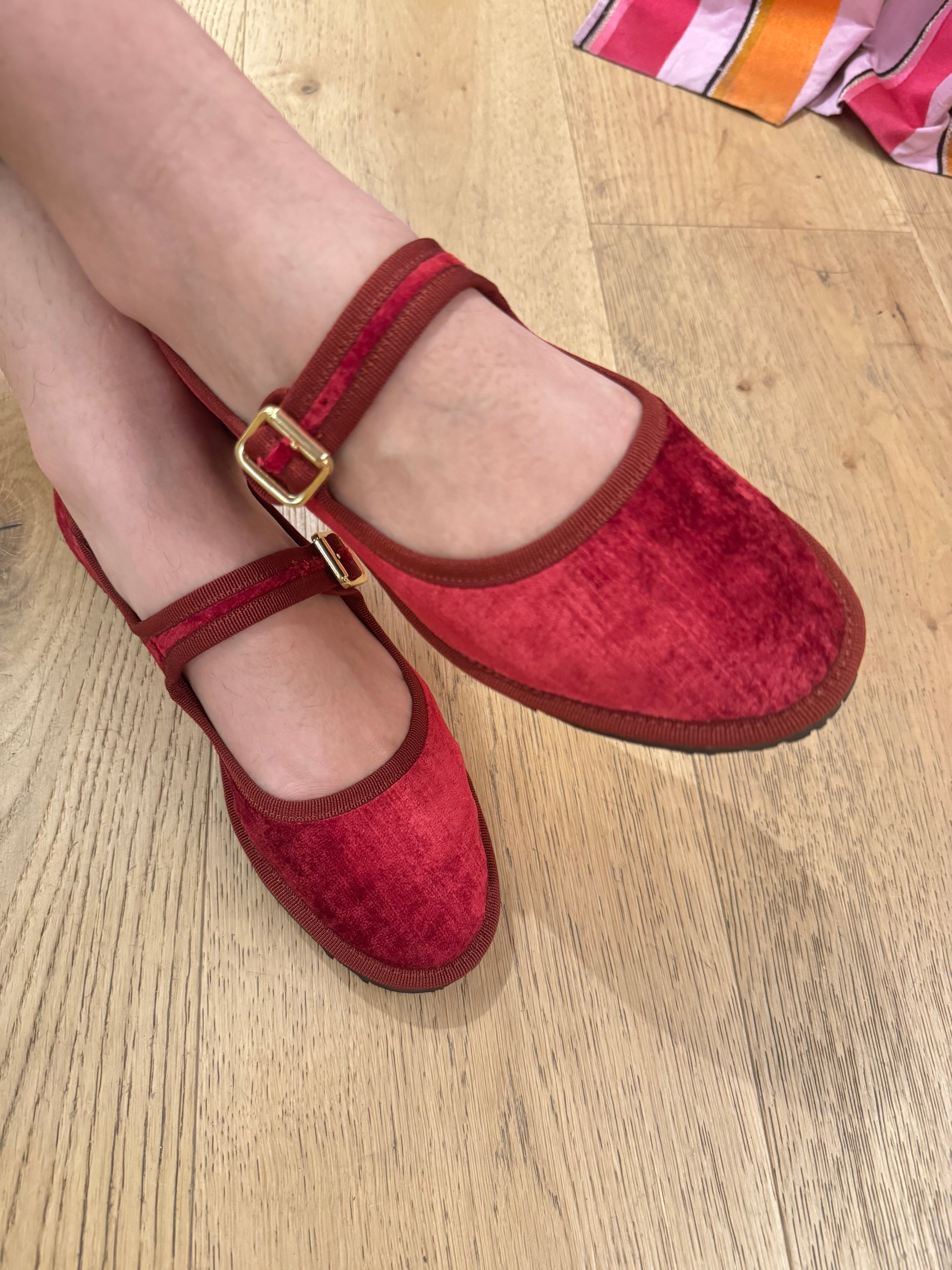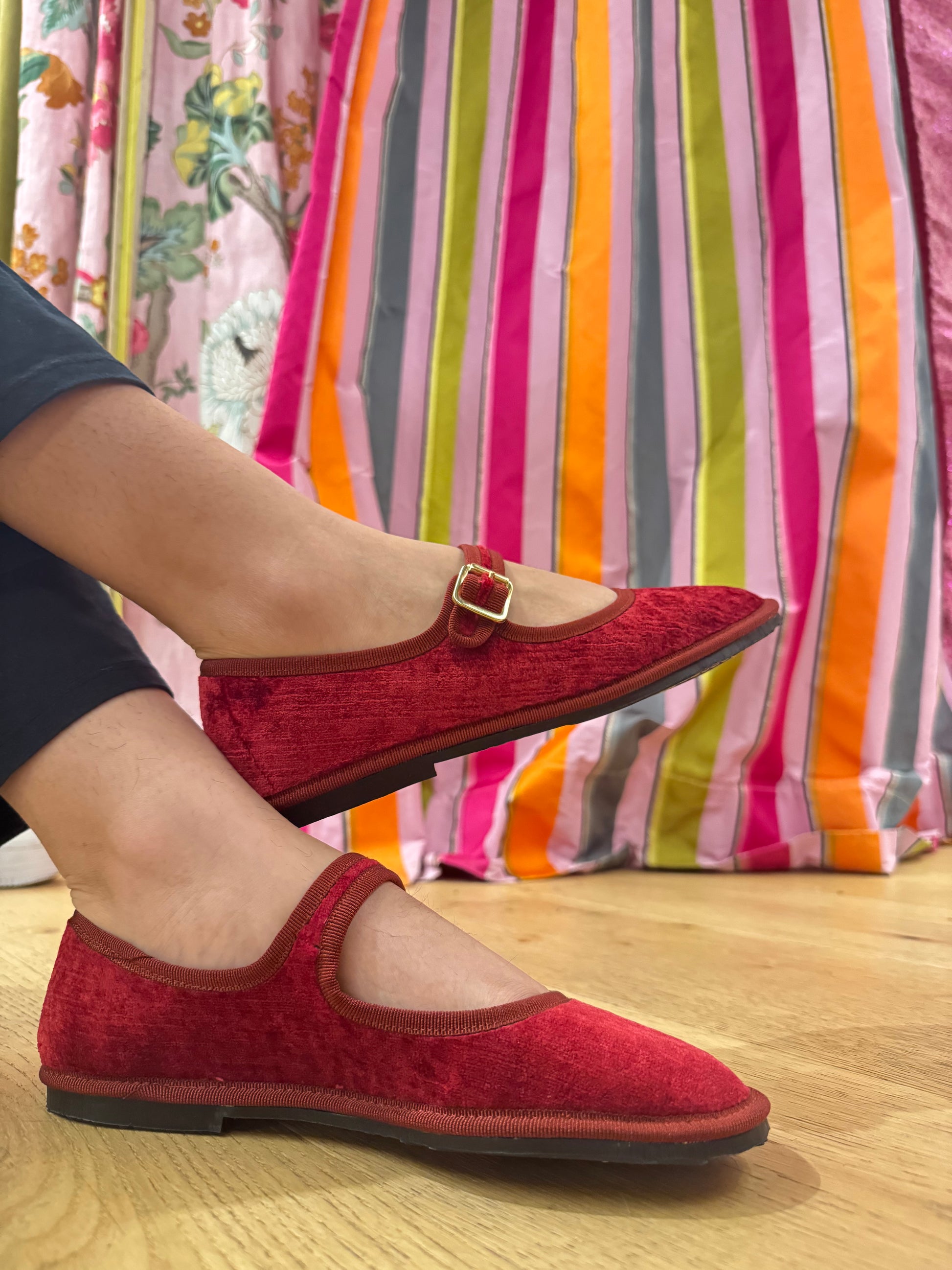 Comode, eleganti, dalle sfumature cangianti, le ballerine di velluto si abbinano ai jeans come agli abiti eleganti. Variante in color rosso. Cinturino sul collo del piede con fibbia dorata. Sottopiede imbottito. Fondo in gomma. Calzata leggermente piccola. Prodotto artigianale italiano