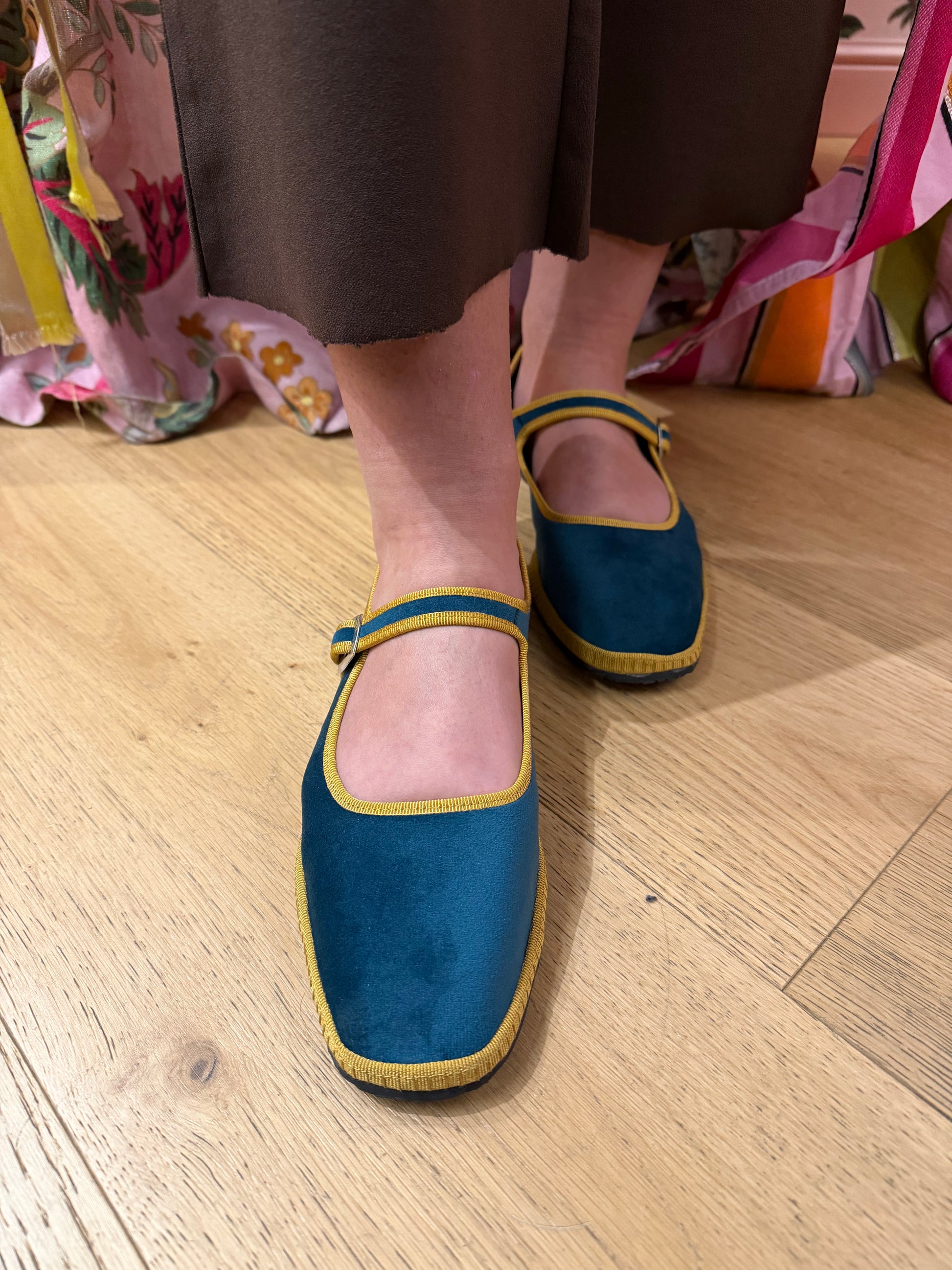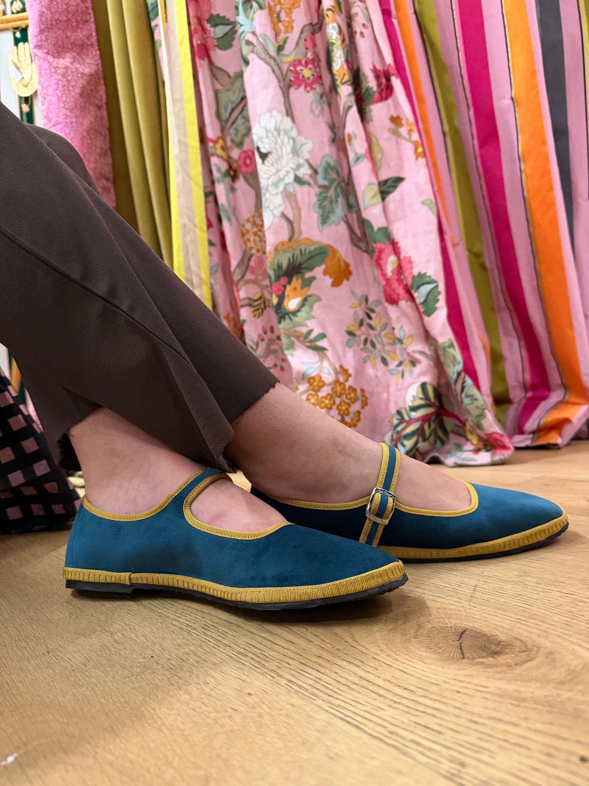 Sono le scarpe flat più chic che si possono indossare nella mezza stagione e non solo. Le friulane, iper chic e sempre di tendenza. Variante realizzata in velluto color petrolio con bordo in contrasto color ocra. Fodera in tessuto, sottopiede in velluto. Fondo in gomma cucito a mano con tacco di 1,5cm. Calzata leggermente piccola. Prodotto artigianale italiano.