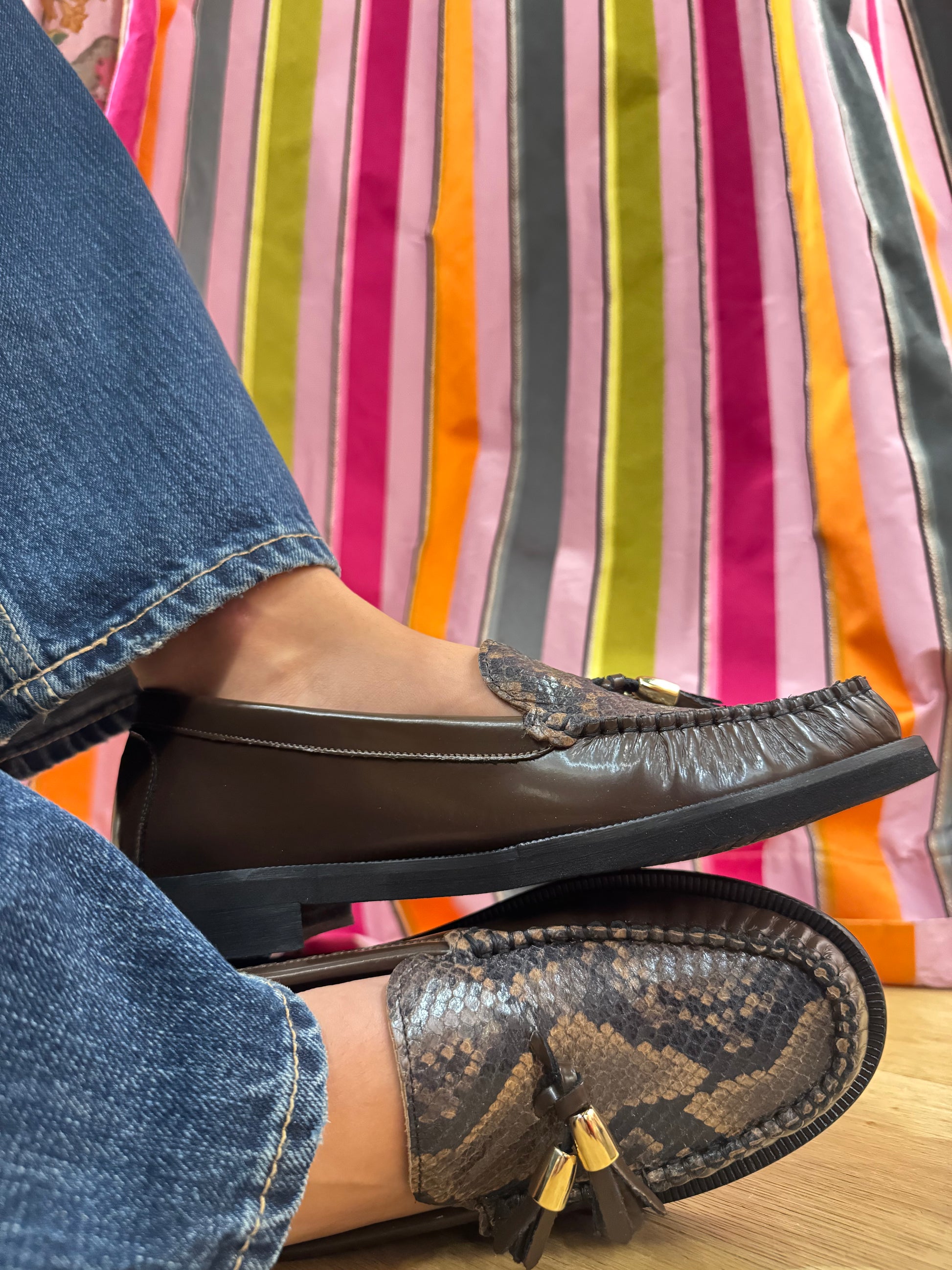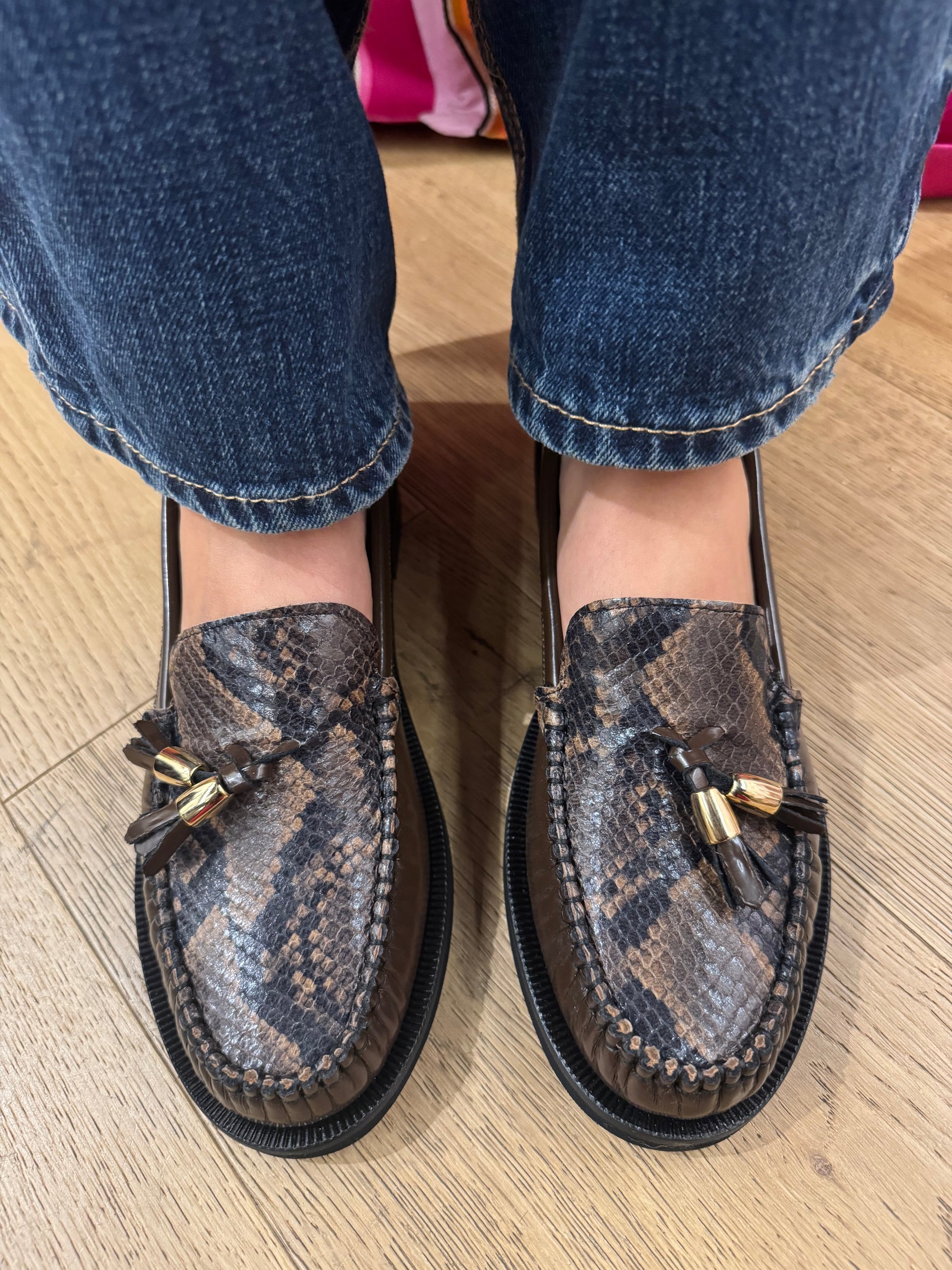 Mocassino da donna realizzato in morbida pelle con stampa effetto pitone, sui toni del marrone e nero. Presenta due nappine sul davanti. Fondo in gomma con tacco alto 2 cm. Pianta larga e comoda. Fodera e sottopiede in pelle. Calzata regolare. Prodotto italiano.
