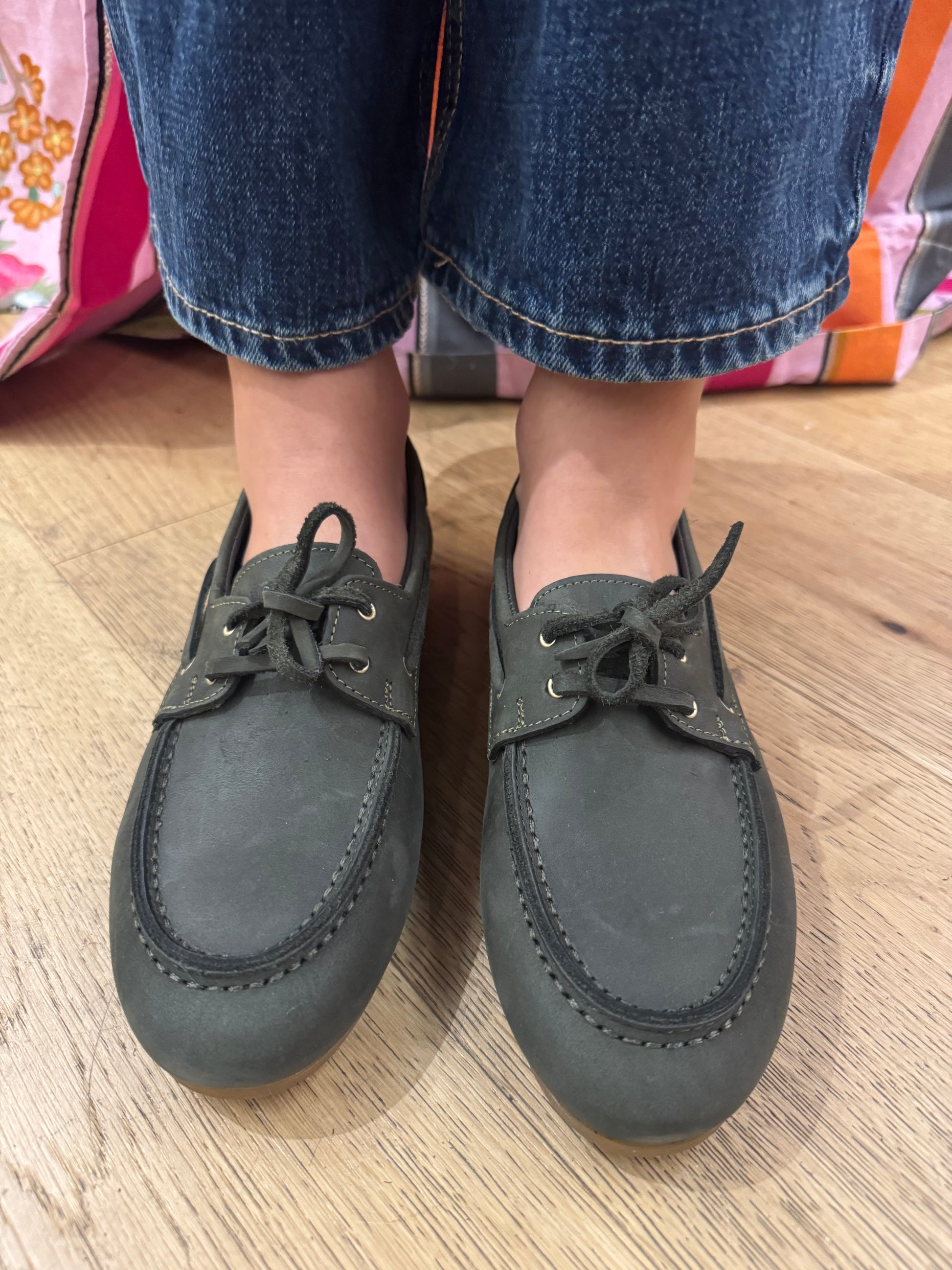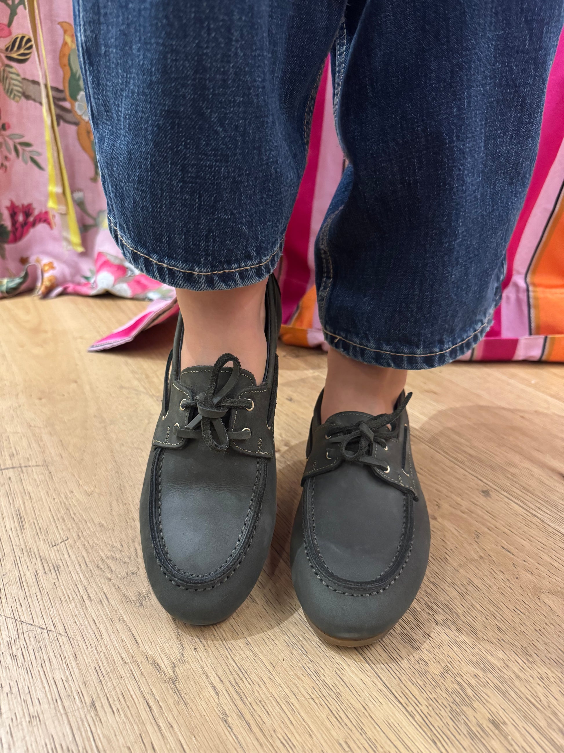Mocassino in pelle color verde oliva, effetto vintage, chiusura con lacci in pelle e suola in gomma alto 1 cm color miele. Pianta larga e comoda. Calzata regolare. Fodera e sottopiede in pelle. Prodotto artigianale fatto in Italia.