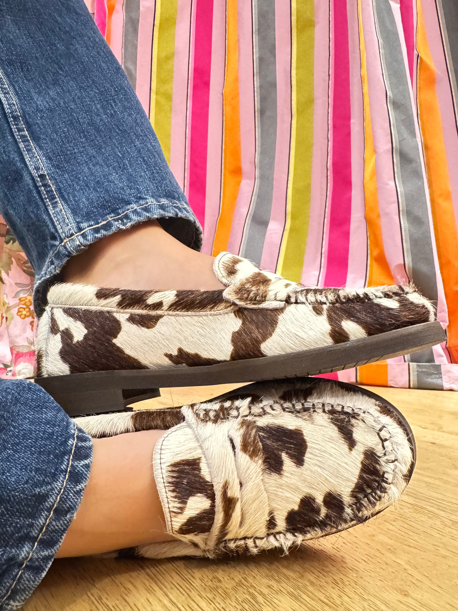 Mocassino donna artigianale realizzato in cavallino stile mucca, di colore bianco e marrone. Forma larga e comoda. Fodera e plantare estraibile in pelle. Fondo in gomma con tacco alto 2 cm. Calzata comoda, regolare. Prodotto italiano.