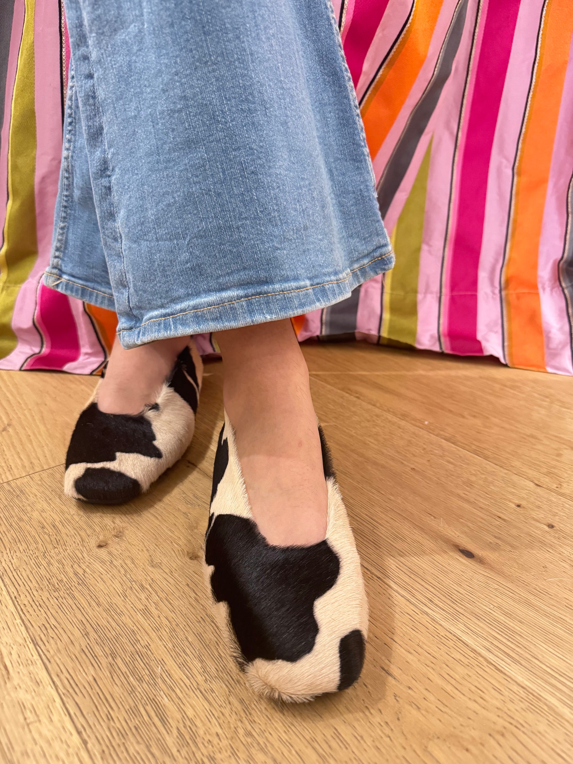 La cow print è la fashion obsession inaspettata del 2025. Proposta in questa ballerina flat con forma a mandorla. Fodera e sottopiede imbottito in pelle. Calzata comoda e regolare.