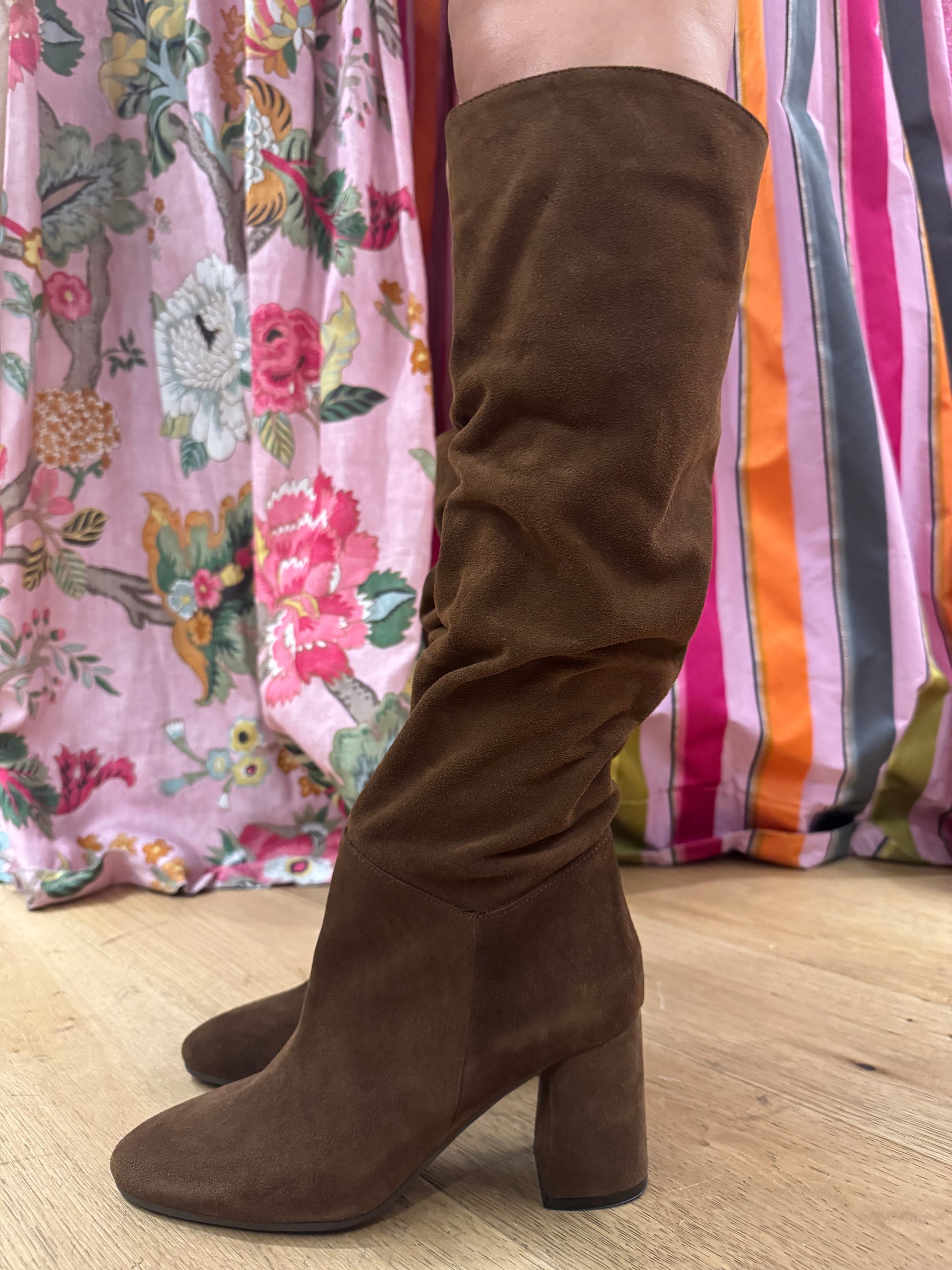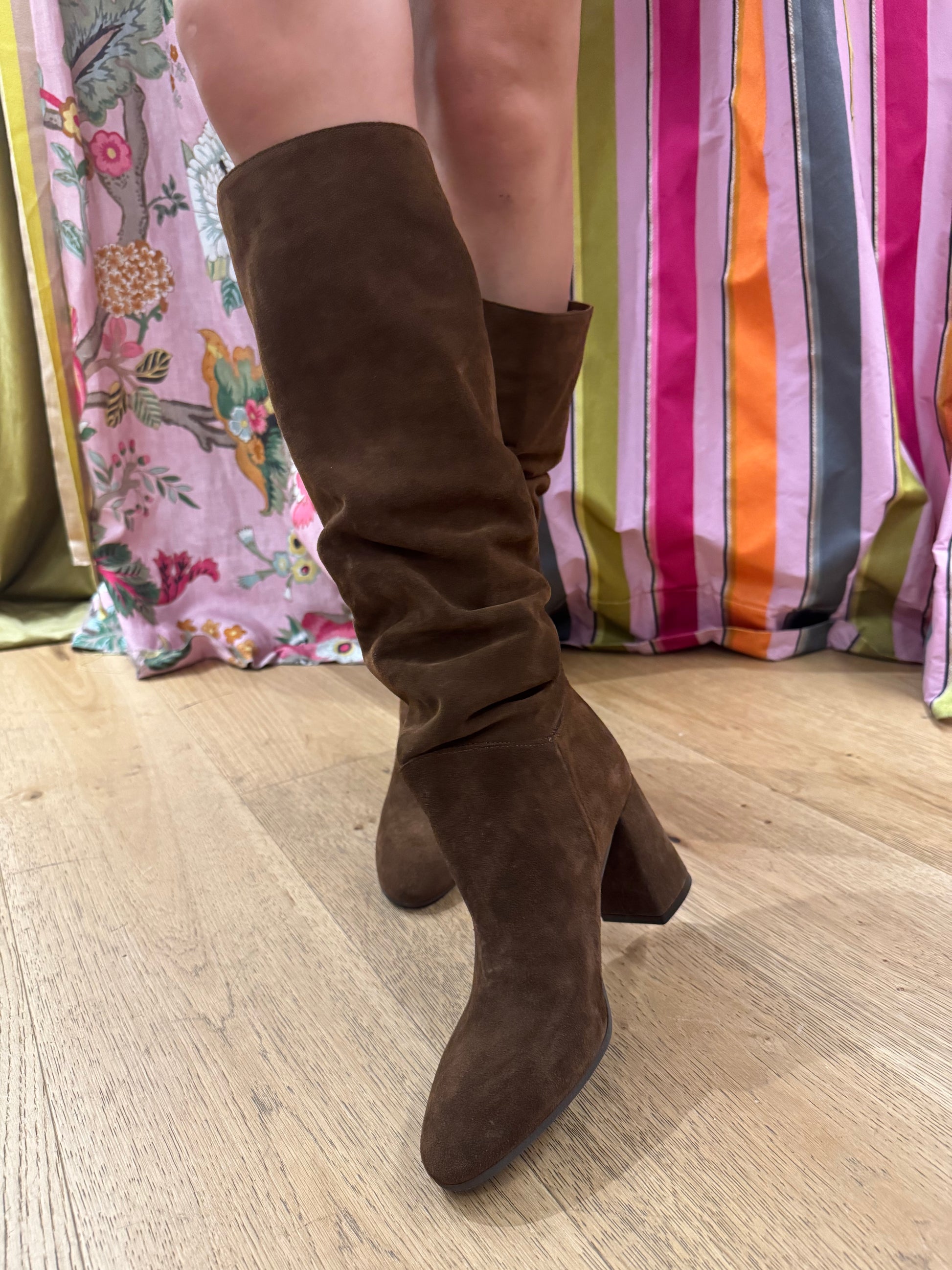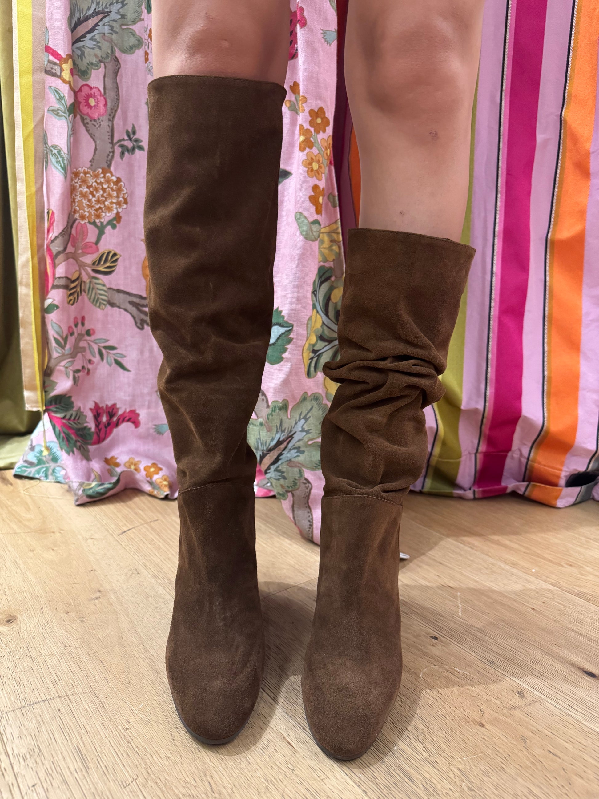 Il cioccolato fa bene all'umore, ma le scarpe sono senza calorie. Stivale realizzato in camoscio color cioccolato. Gambale alto ,destrutturato morbido. Forma tonda, pianta comoda. Tacco ricoperto alto 8cm. Sottopiede in pelle. Calzata leggermente piccola. Prodotto italiano.